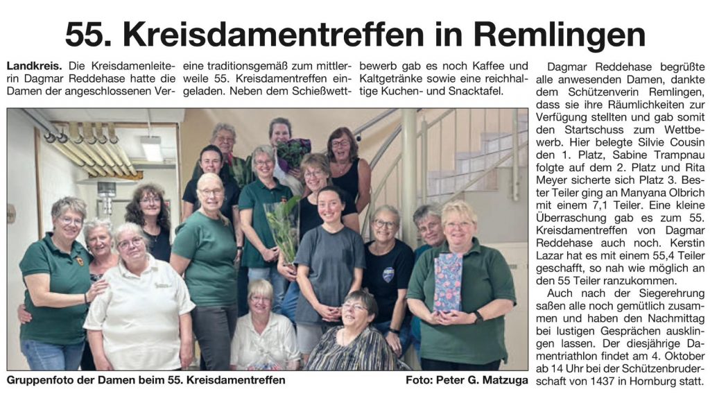 Am 21.09.2024 fand der alljährliche Kreis Damen Triathlon in Remlingen statt, bei dem sich die Teilnehmerinnen sportlich messen und gleichzeitig viel Spaß haben konnten. Nach einem ereignisreichen Wettkampftag, bei dem Disziplinen wie Blasrohrschießen, Lichtpunktschießen und Dart ausgetragen wurden, versammelten sich die Damen in gemütlicher Runde.